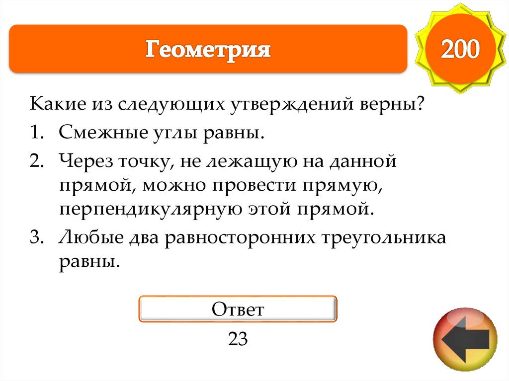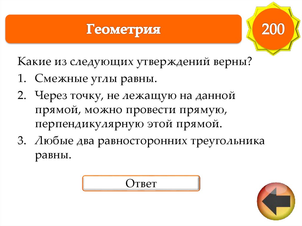 Какие из следующих утверждений верны?1. Смежные углы равны.