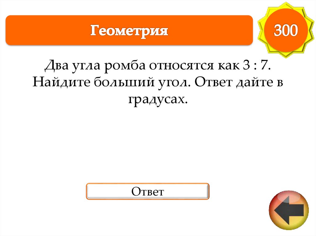 Два угла ромба относятся как 3 : 7.Найдите больший угол. Ответ дайте в