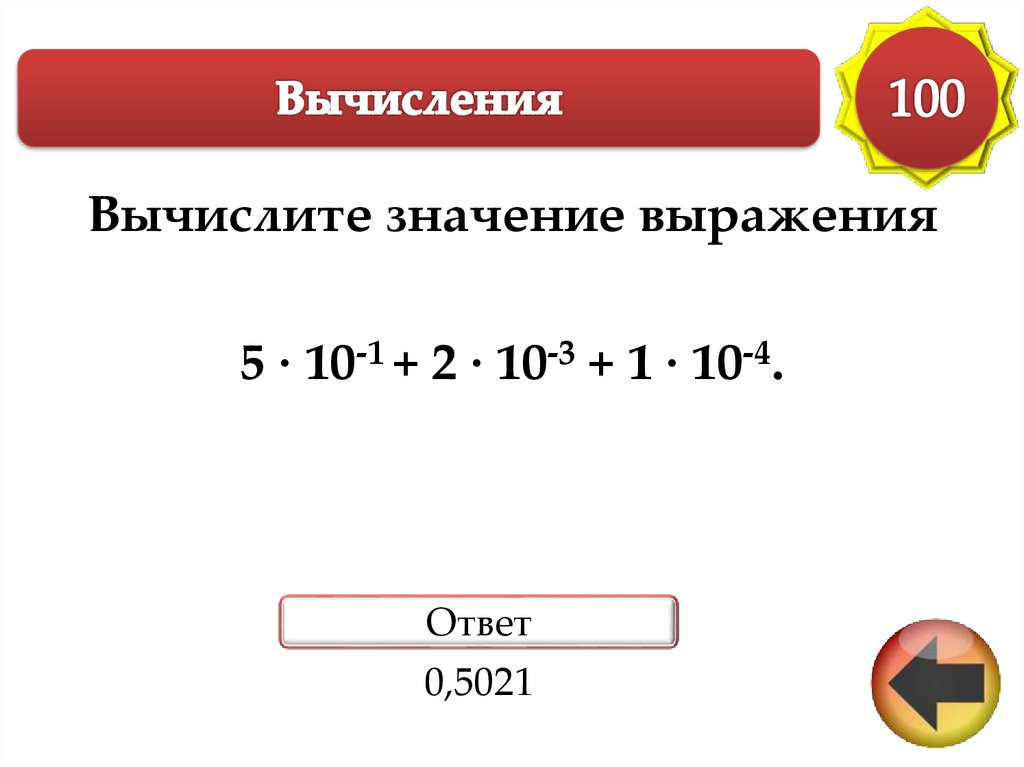 Вычислите значение выражения5 ∙ 10-1 + 2 ∙ 10-3 + 1 ∙ 10-4.