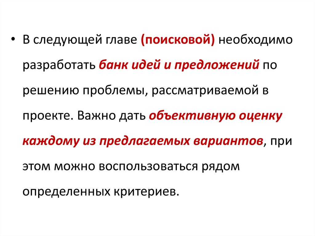 • В следующей главе (поисковой) необходиморазработать банк идей и предложений по