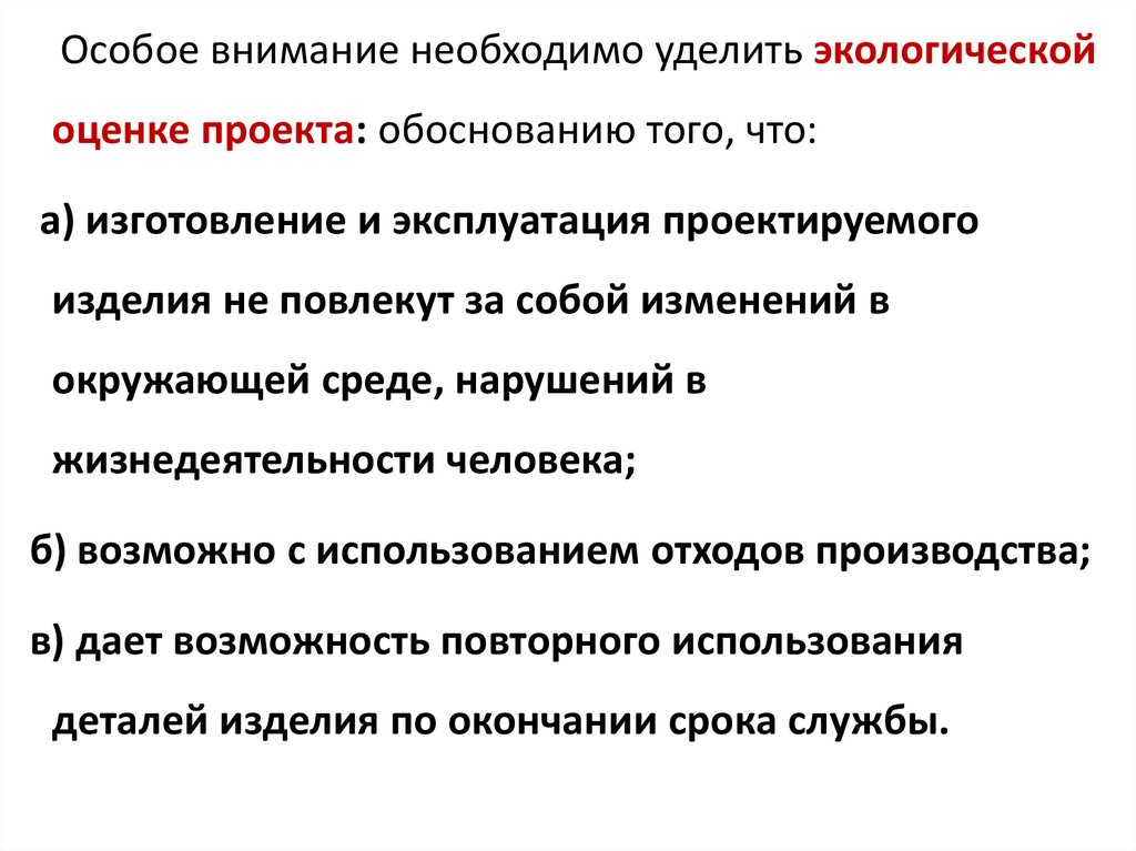 Особое внимание необходимо уделить экологическойоценке проекта: обоснованию того, что:
