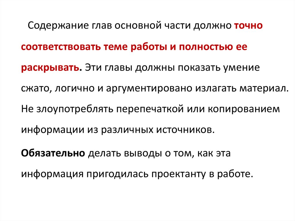 Содержание глав основной части должно точносоответствовать теме работы и полностью ее