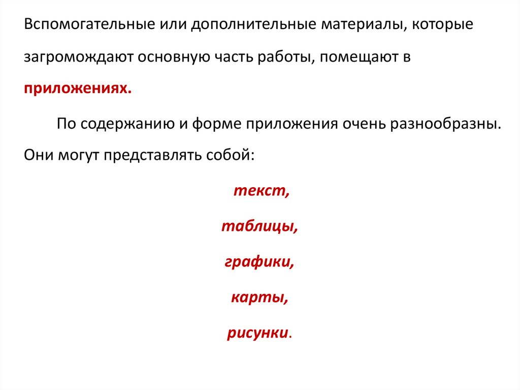 Вспомогательные или дополнительные материалы, которыезагромождают основную часть работы, помещают в