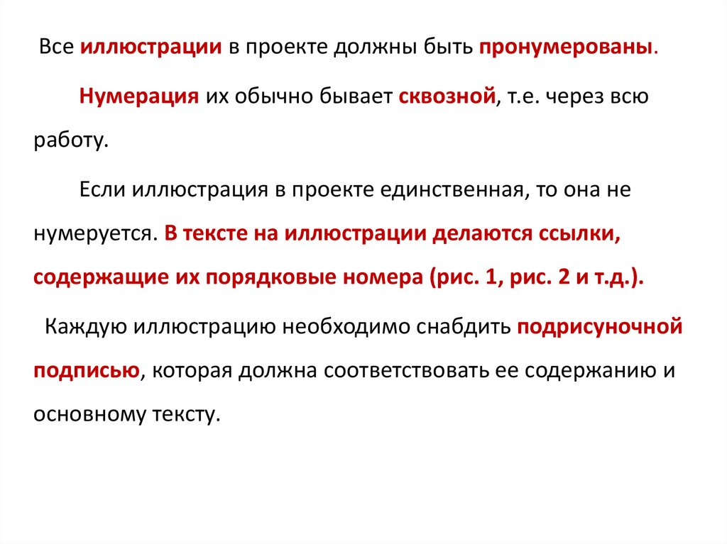 Все иллюстрации в проекте должны быть пронумерованы.Нумерация их обычно бывает сквозной, т.е. через всю