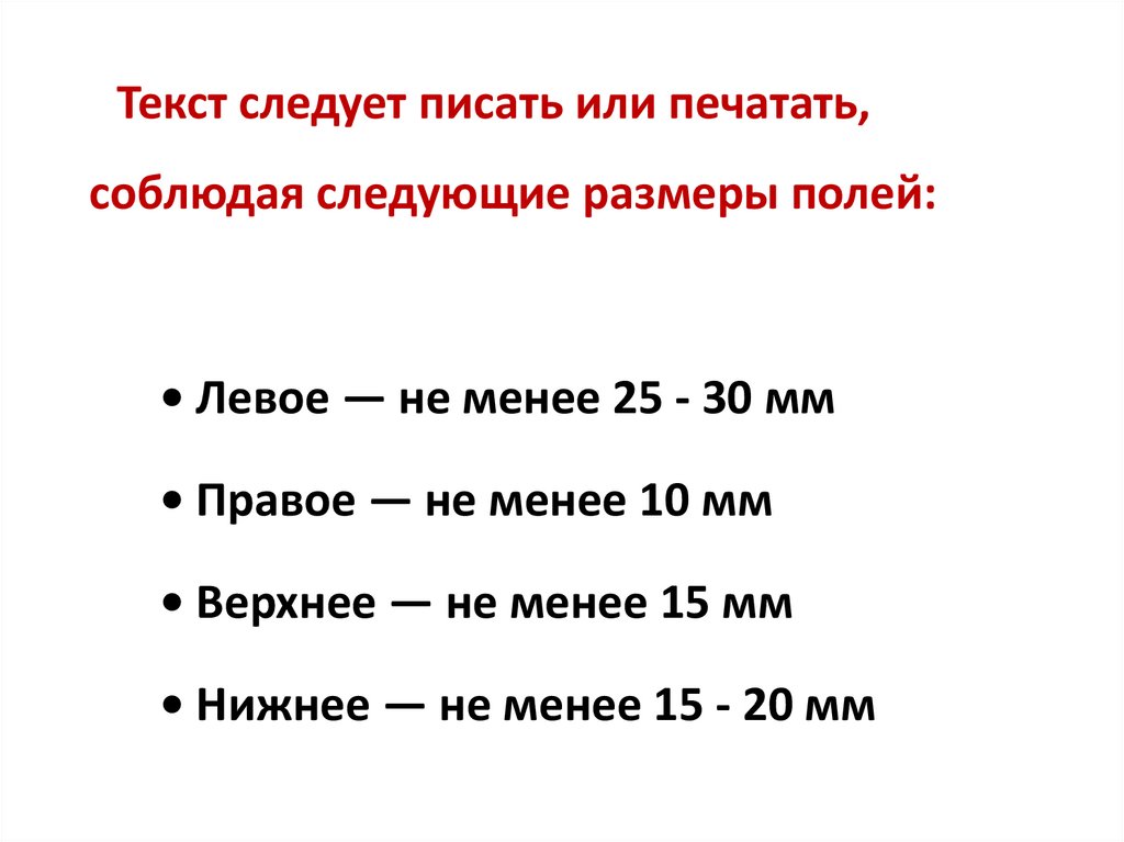 Текст следует писать или печатать,соблюдая следующие размеры полей: