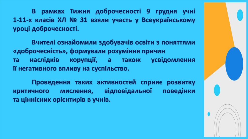 В рамках Тижня доброчесності 9 грудня учні1-11-х класів ХЛ № 31 взяли участь у Всеукраїнському
