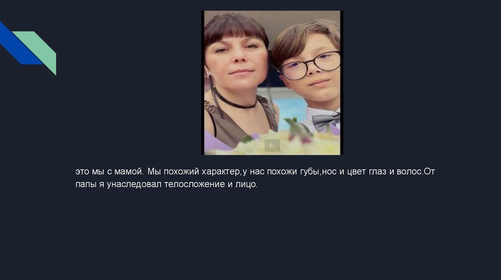 это мы с мамой. Мы похожий характер,у нас похожи губы,нос и цвет глаз и волос.От