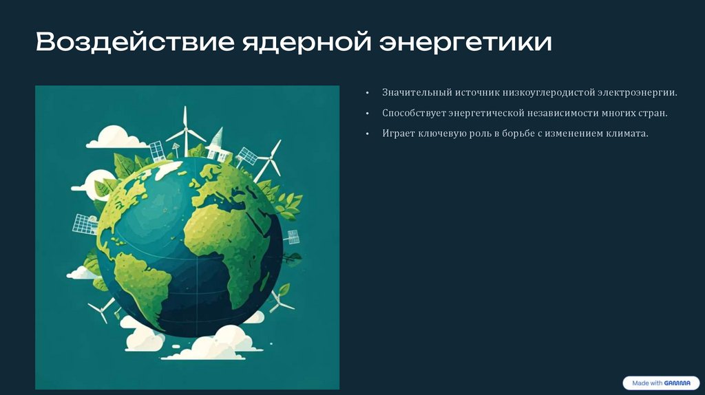 Воздействие ядерной энергетикиЗначительный источник низкоуглеродистой электроэнергии.