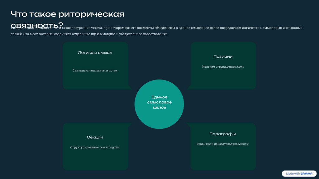 Риторическая связность — это такое построение текста, при котором все его элементы объединены в единое смысловое целое посредством логических, смысловых и языковых