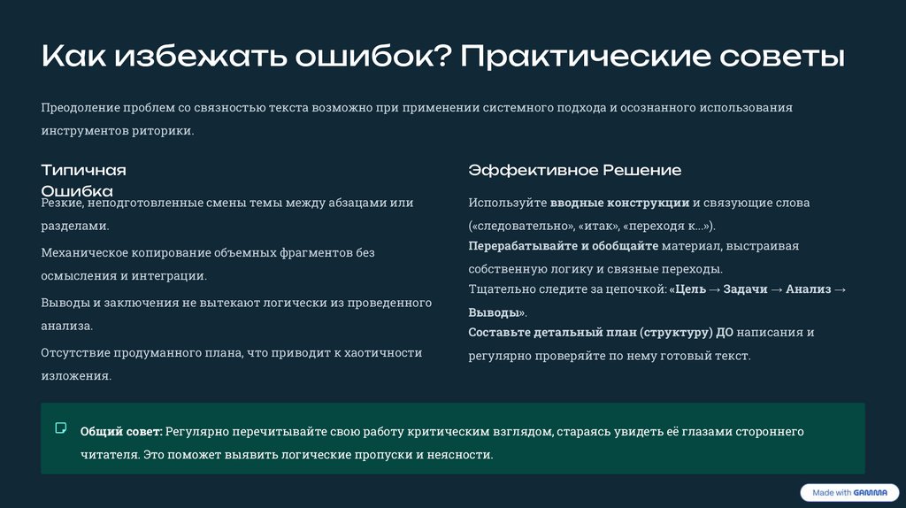 Как избежать ошибок? Практические советыПреодоление проблем со связностью текста возможно при применении системного подхода и осознанного использования