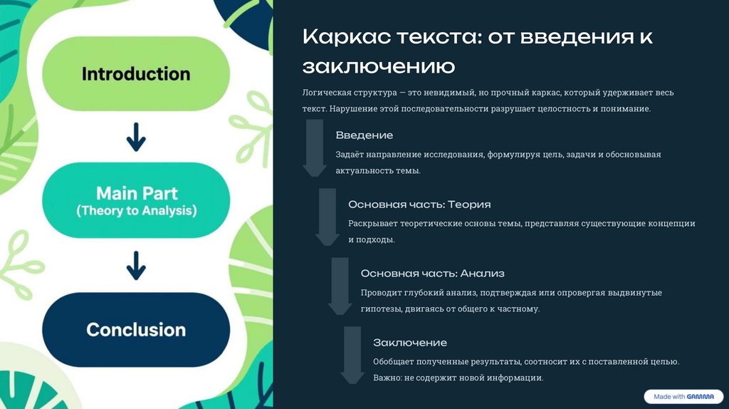 Она строится на трёх взаимосвязанных основаниях: продуманная логическая структура, композиционная