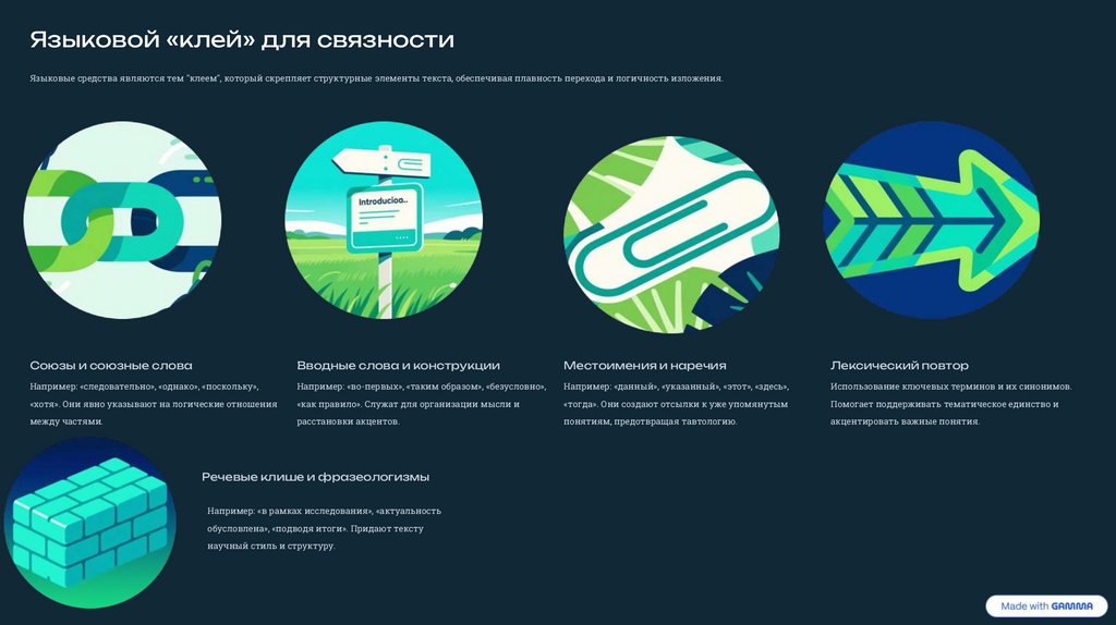 Языковой «клей» для связностиЯзыковые средства являются тем "клеем", который скрепляет структурные элементы текста, обеспечивая плавность перехода и логичность изложения.