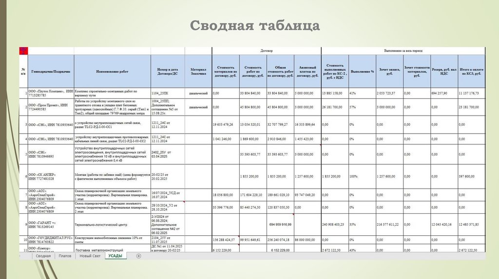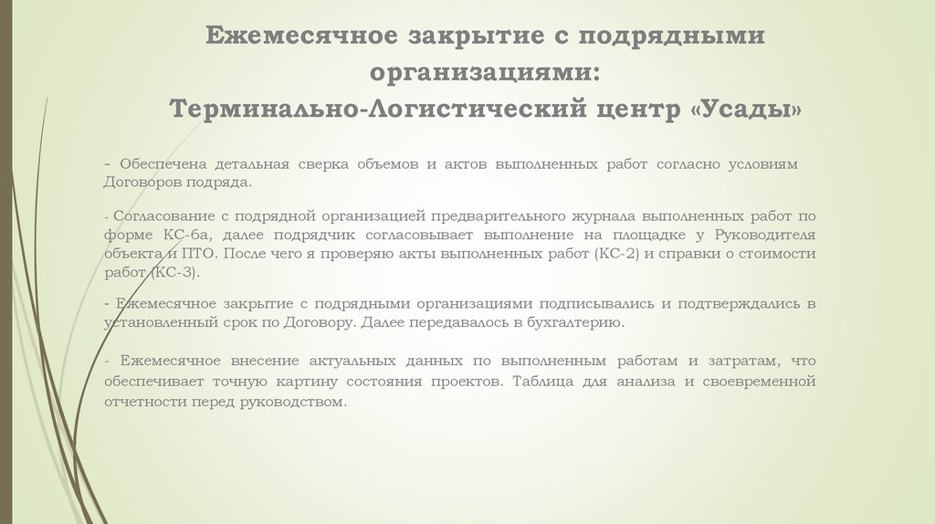- Ежемесячное закрытие с подрядными организациями подписывались и подтверждались в