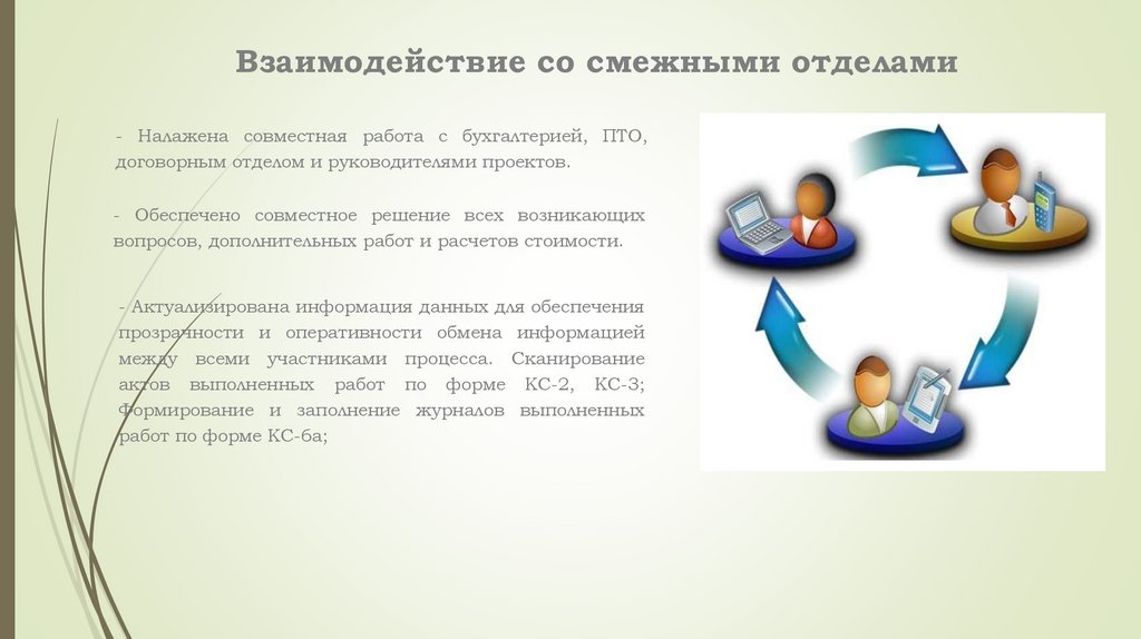 Взаимодействие со смежными отделами- Налажена совместная работа с бухгалтерией, ПТО,