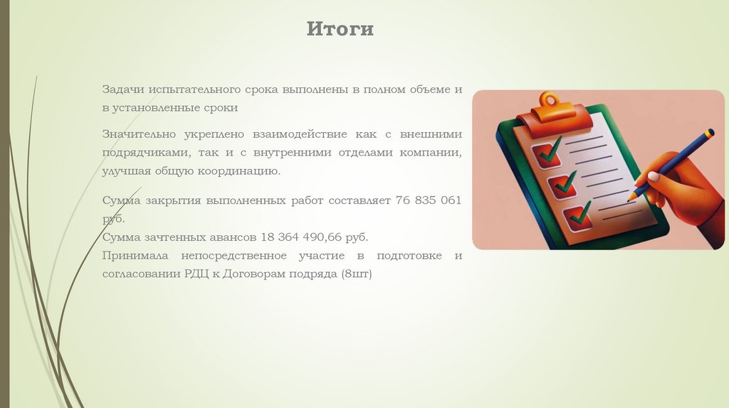 ИтогиЗадачи испытательного срока выполнены в полном объеме и