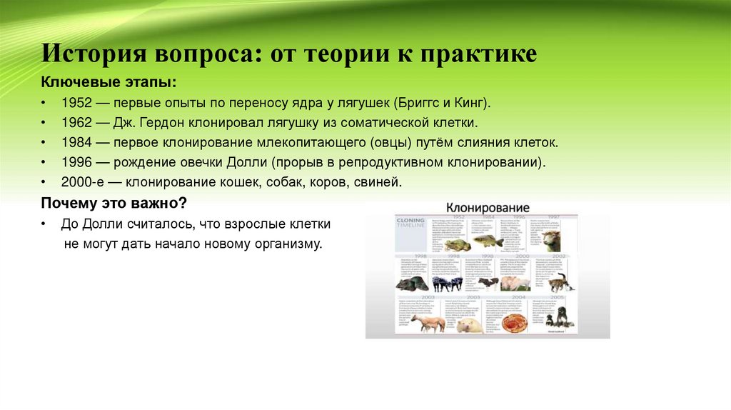 1996 — рождение овечки Долли (прорыв в репродуктивном клонировании).