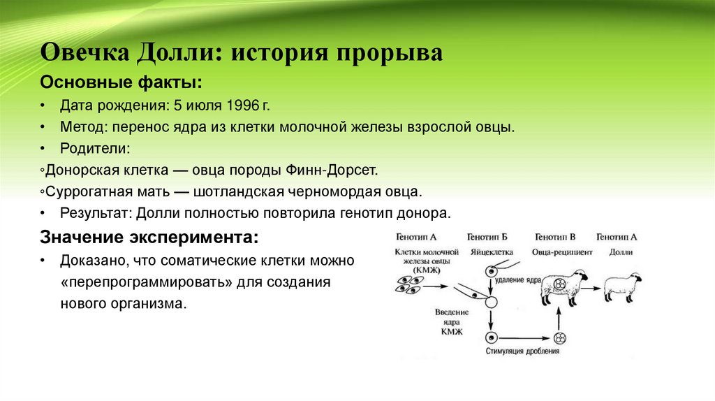 • Метод: перенос ядра из клетки молочной железы взрослой овцы.