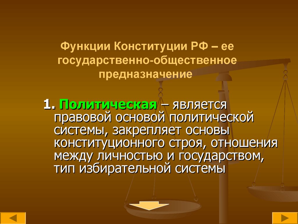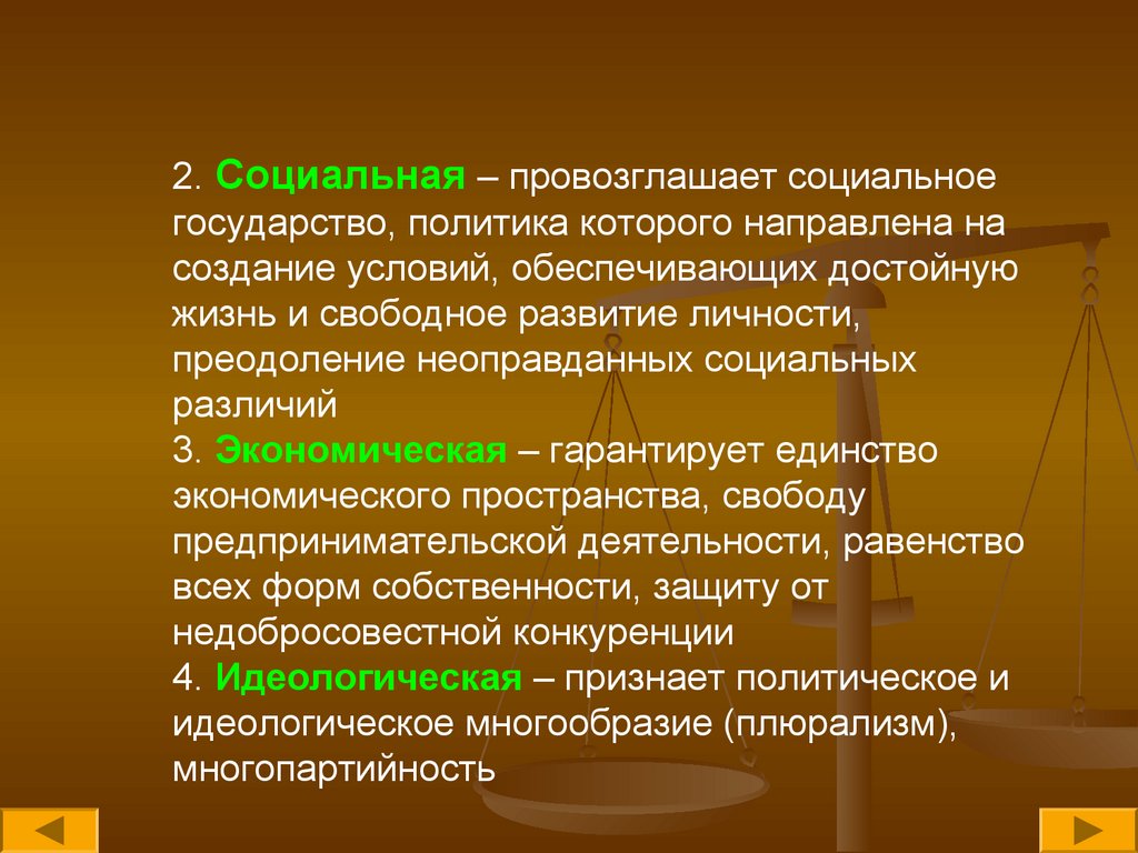 2. Социальная – провозглашает социальноегосударство, политика которого направлена на