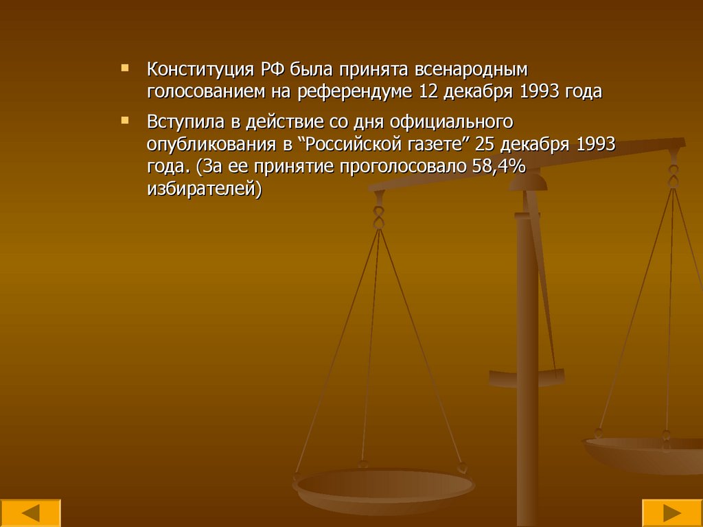 Конституция РФ была принята всенароднымголосованием на референдуме 12 декабря 1993 года