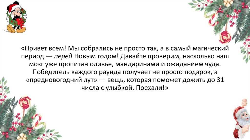 «Привет всем! Мы собрались не просто так, а в самый магическийпериод — перед Новым годом! Давайте проверим, насколько наш