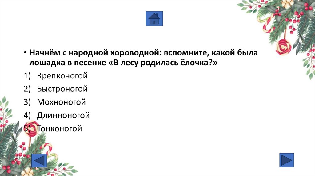 • Начнём с народной хороводной: вспомните, какой былалошадка в песенке «В лесу родилась ёлочка?»