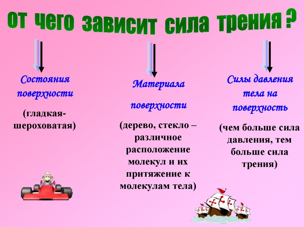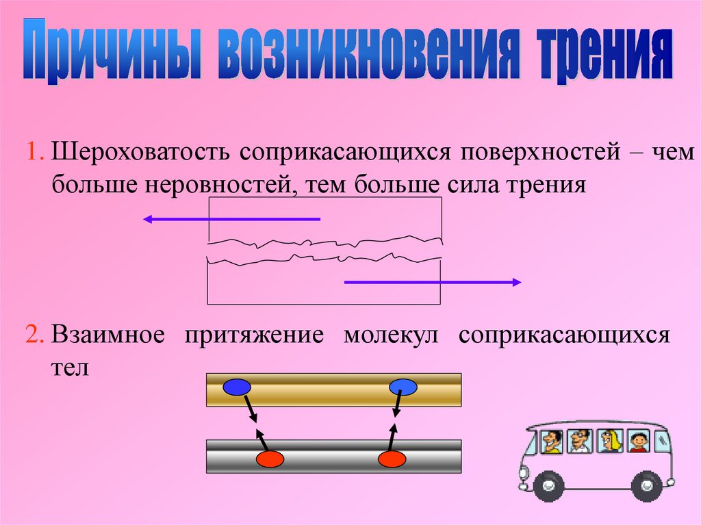 1. Шероховатость соприкасающихся поверхностей – чембольше неровностей, тем больше сила трения