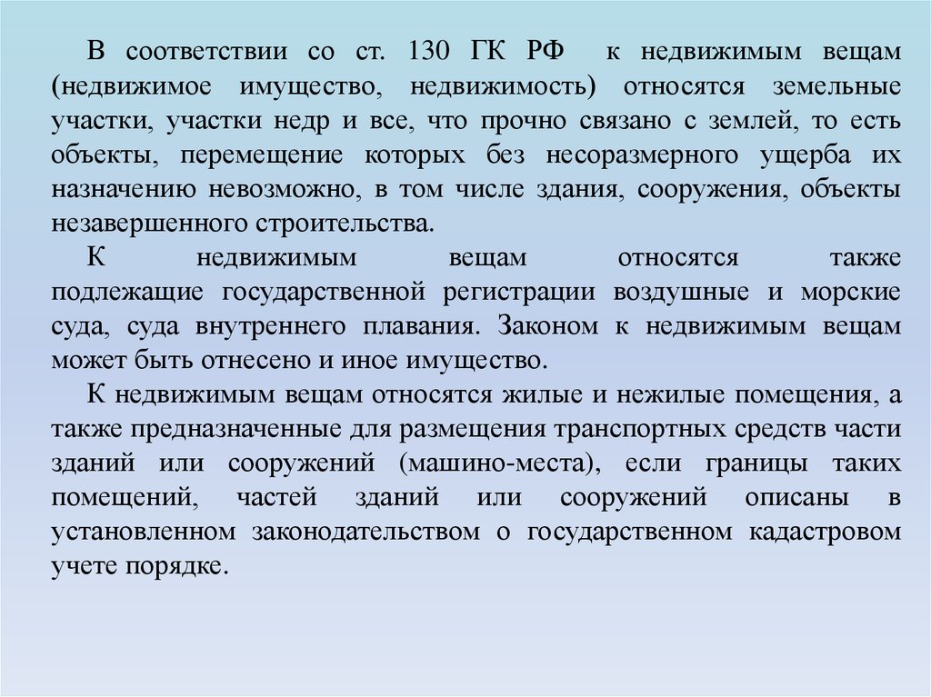 В соответствии со ст. 130 ГК РФ к недвижимым вещам(недвижимое имущество, недвижимость) относятся земельные