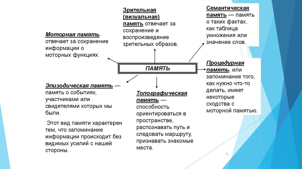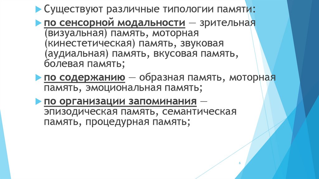 Существуют различные типологии памяти:по сенсорной модальности — зрительная