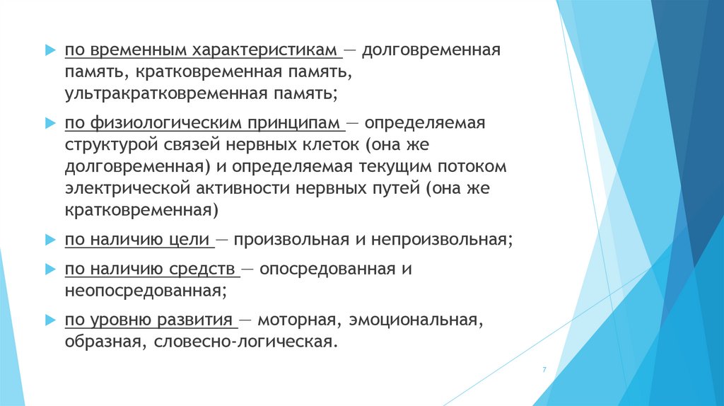 по временным характеристикам — долговременнаяпамять, кратковременная память,