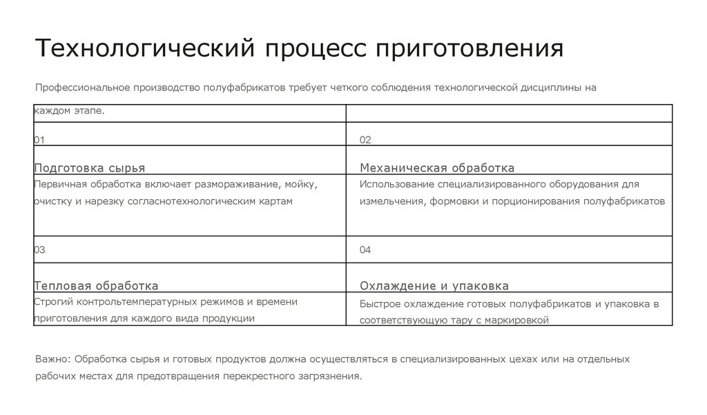 Технологический процесс приготовленияПрофессиональное производство полуфабрикатов требует четкого соблюдения технологической дисциплины на