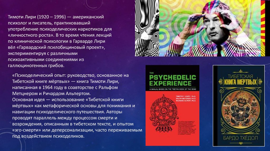 Тимоти Лири (1920 – 1996) — американскийпсихолог и писатель, практиковавший