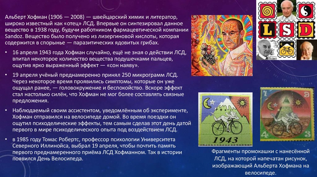 • 16 апреля 1943 года Хофман случайно, ещё не зная о действии ЛСД,