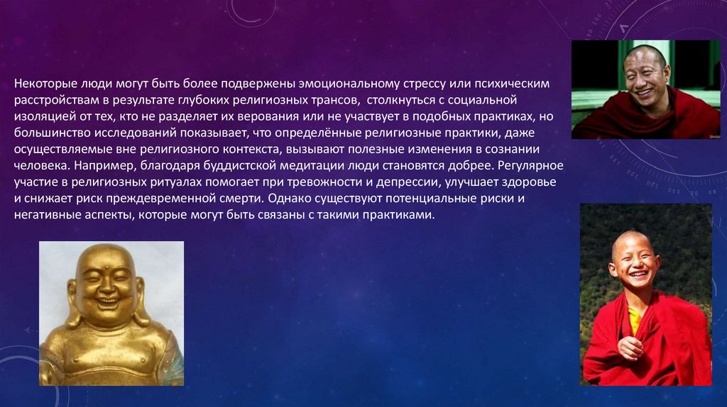 Некоторые люди могут быть более подвержены эмоциональному стрессу или психическимрасстройствам в результате глубоких религиозных трансов, столкнуться с социальной