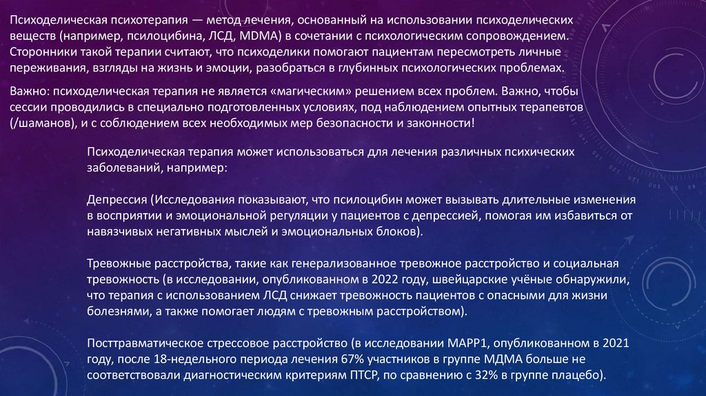 Важно: психоделическая терапия не является «магическим» решением всех проблем. Важно, чтобы