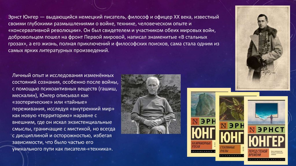 Эрнст Юнгер — выдающийся немецкий писатель, философ и офицер XX века, известныйсвоими глубокими размышлениями о войне, технике, человеческом опыте и