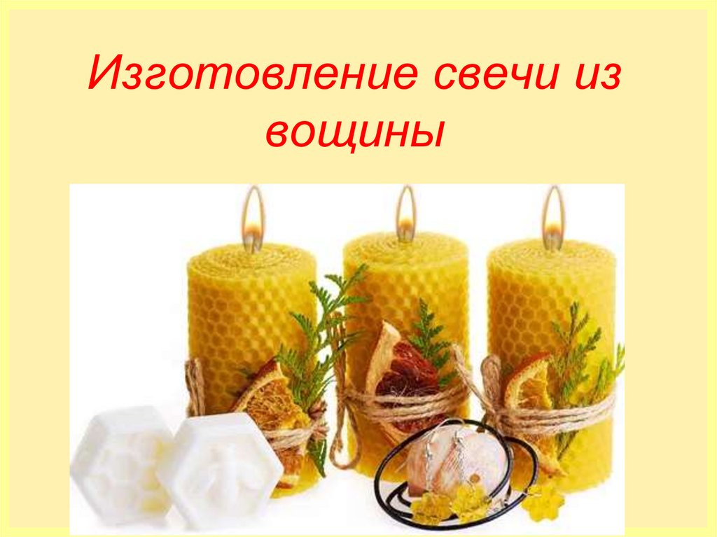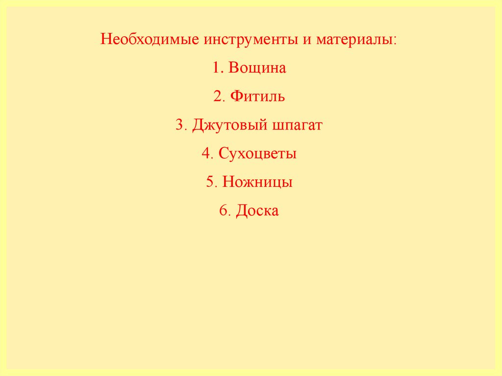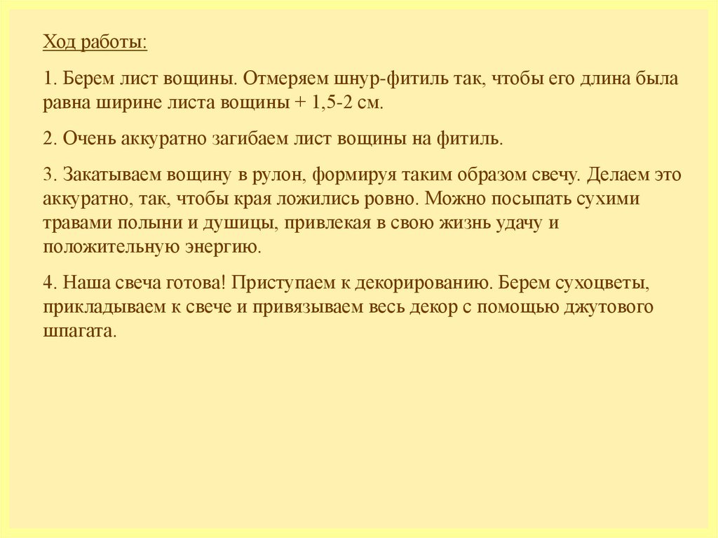 Ход работы:1. Берем лист вощины. Отмеряем шнур-фитиль так, чтобы его длина была