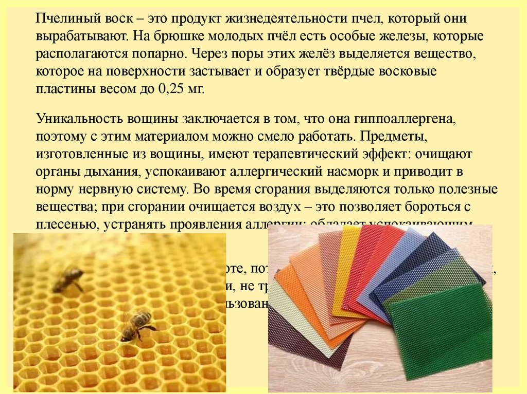 Пчелиный воск – это продукт жизнедеятельности пчел, который онивырабатывают. На брюшке молодых пчёл есть особые железы, которые