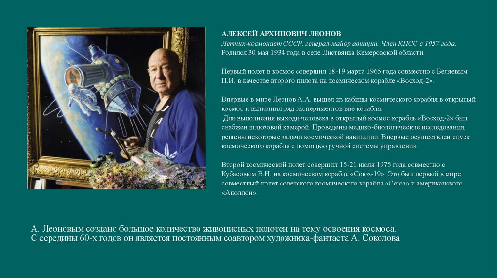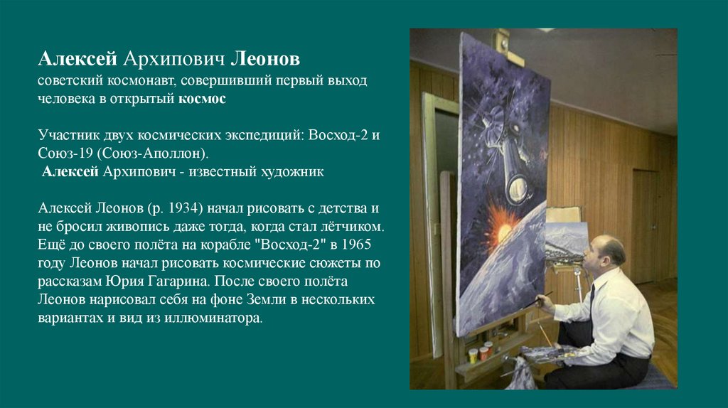 А. Леоновым создано большое количество живописных полотен на тему освоения космоса.
