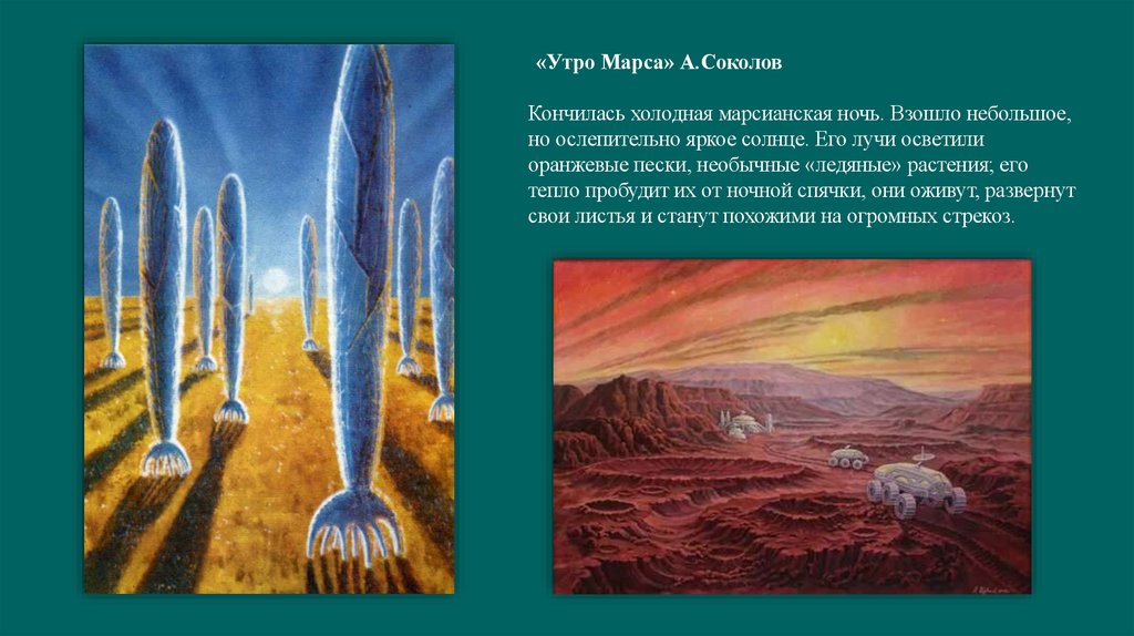 «Утро Марса» А.СоколовКончилась холодная марсианская ночь. Взошло небольшое,