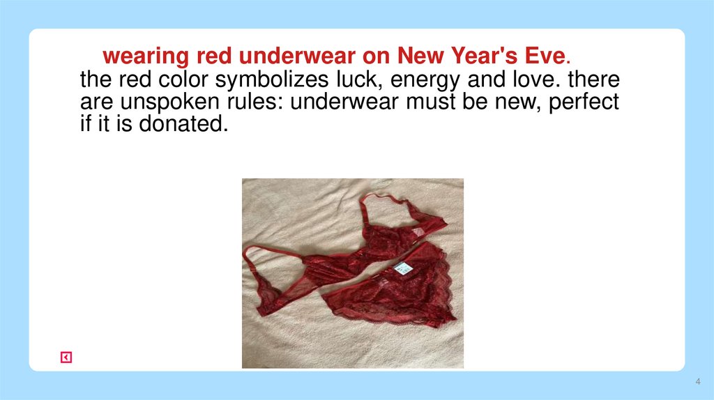 wearing red underwear on New Year's Eve.the red color symbolizes luck, energy and love. there