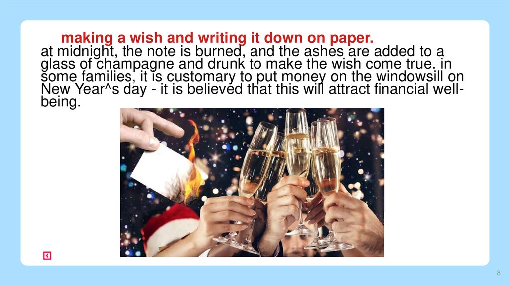 making a wish and writing it down on paper.at midnight, the note is burned, and the ashes are added to a
