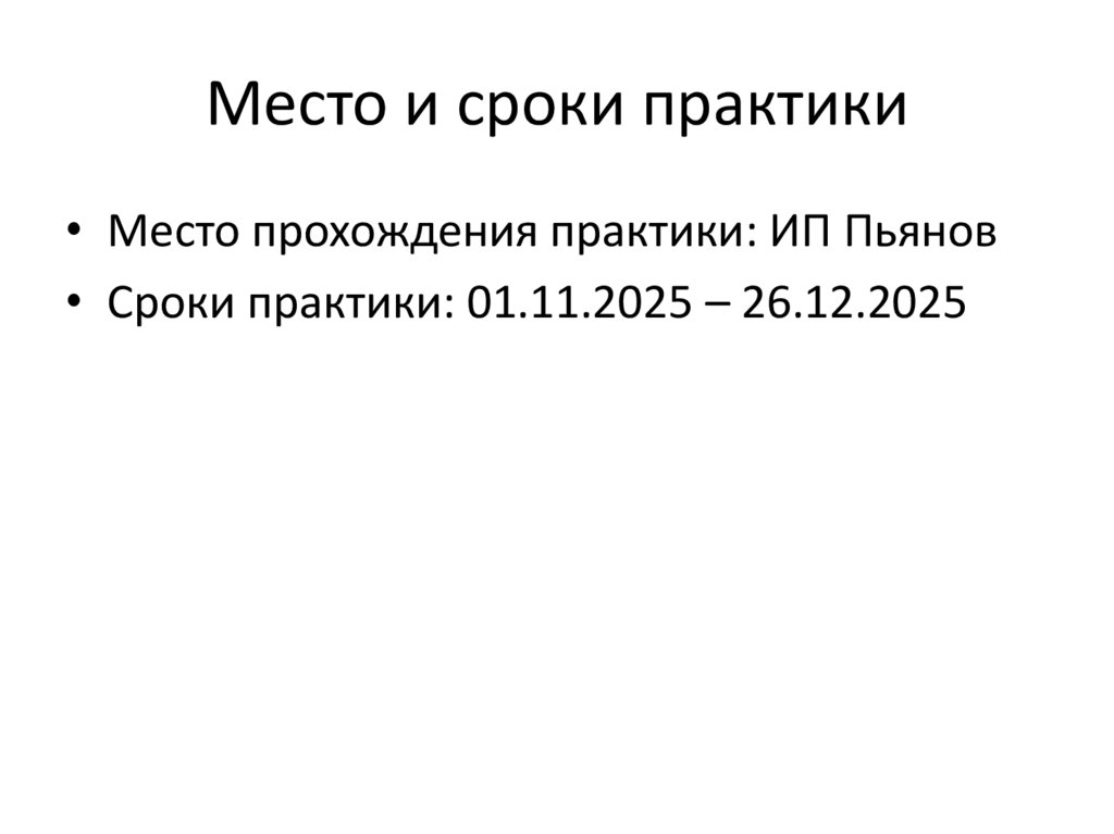 Место и сроки практики• Место прохождения практики: ИП Пьянов