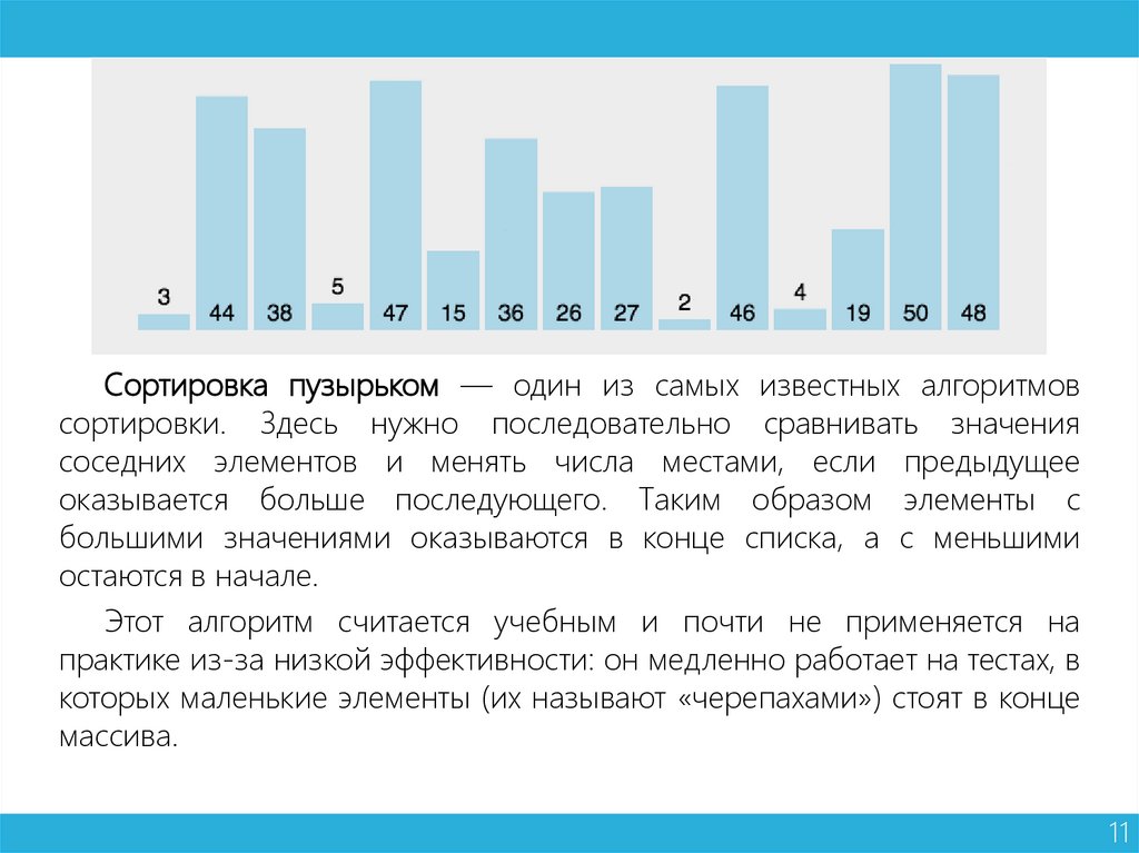 Сортировка пузырьком — один из самых известных алгоритмовсортировки. Здесь нужно последовательно сравнивать значения