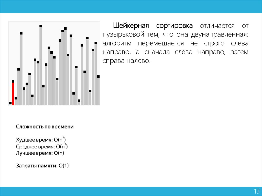 Шейкерная сортировка отличается отпузырьковой тем, что она двунаправленная:
