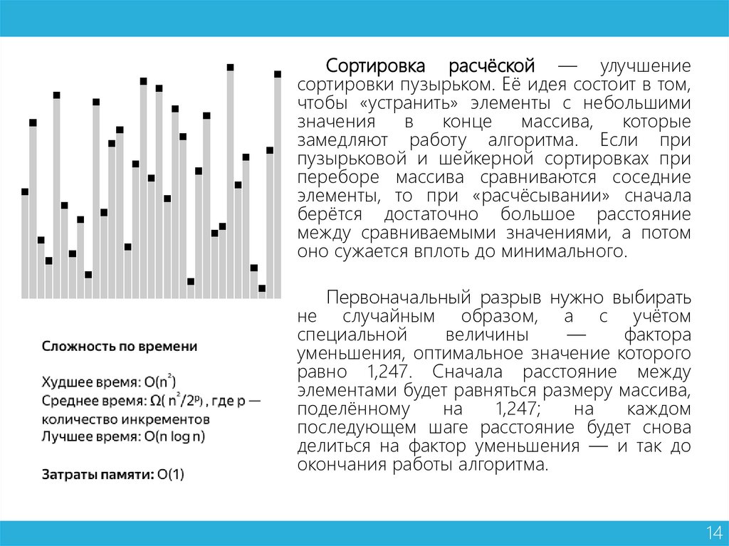 Сортировка расчёской — улучшениесортировки пузырьком. Её идея состоит в том,