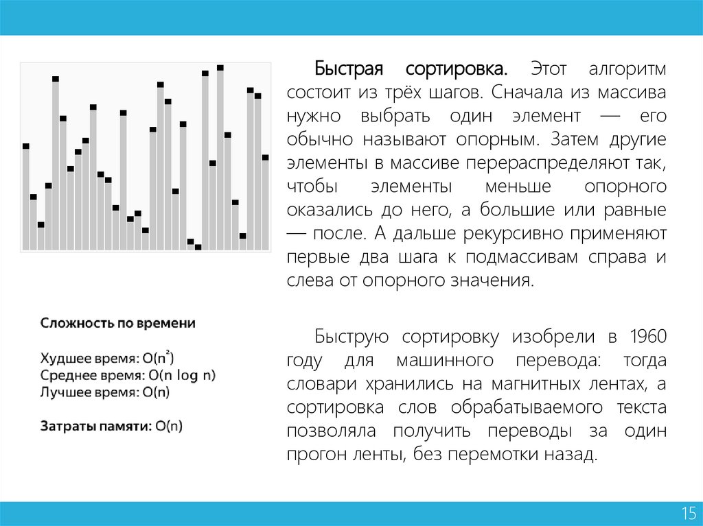 Быстрая сортировка. Этот алгоритмсостоит из трёх шагов. Сначала из массива