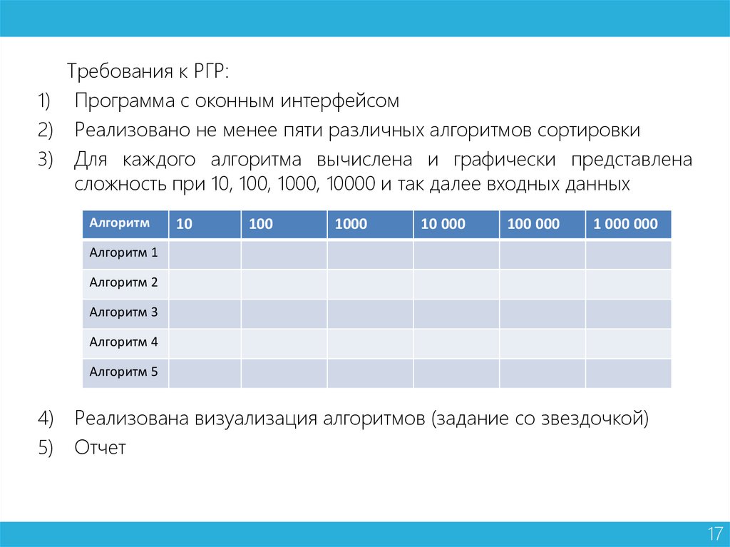 2) Реализовано не менее пяти различных алгоритмов сортировки