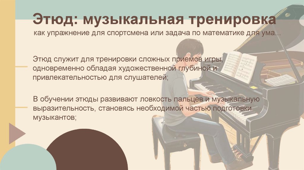 В обучении этюды развивают ловкость пальцев и музыкальную