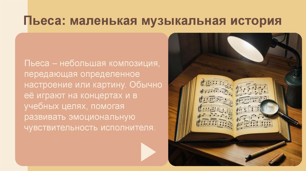 Пьеса: маленькая музыкальная историяПьеса – небольшая композиция,