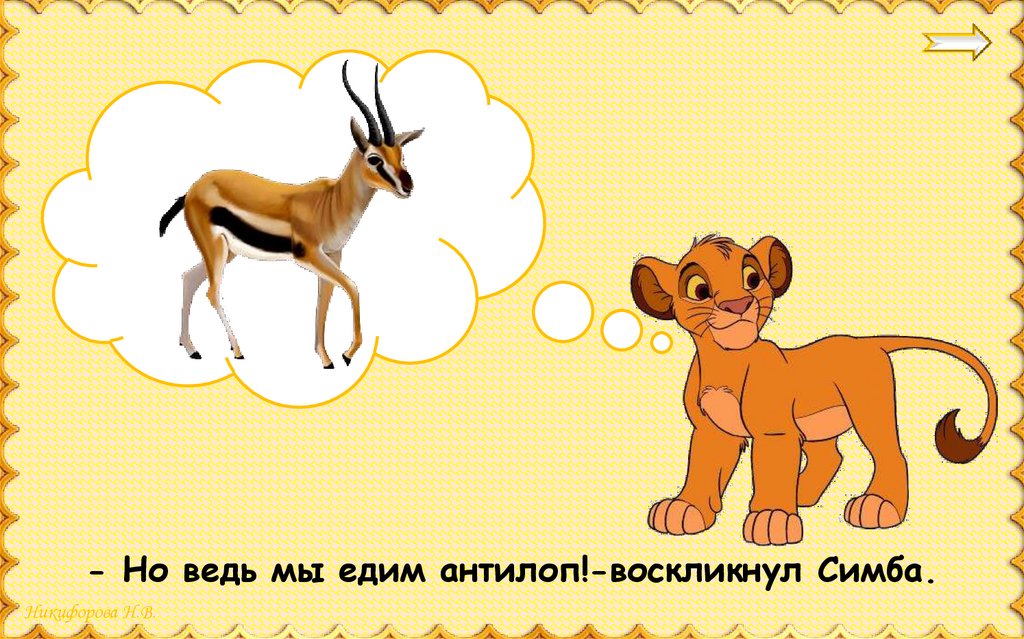 - Но ведь мы едим антилоп!-воскликнул Симба.Никифорова Н.В.
